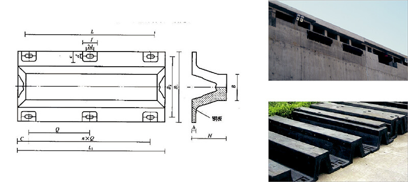 1.反力、吸能量適中 2.底部寬度小,特別適用于框式碼頭 3.重量輕,安裝維護(hù)方便| 型號(hào) | H | B | L | 孔數(shù) | Q | C | h | D | D |